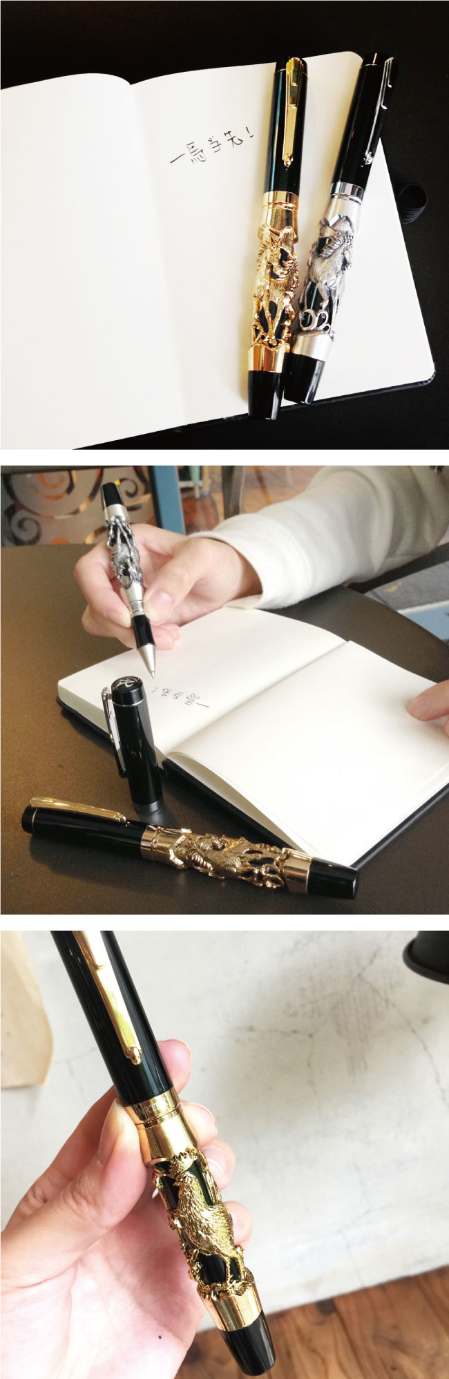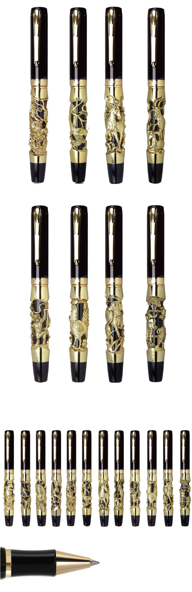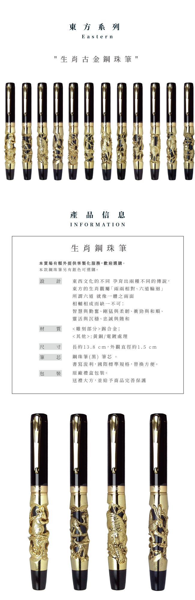 【材質】立體雕刻部分採錫合金鑄造技法、其餘筆身則使用黃銅進行烤漆與電鍍處理。 【尺寸】旋轉式筆蓋、筆尺寸長13.8、直徑1.5CM 【筆芯】選用德國SCHMIDT施密特高級長效型水性黑色0.6mm鋼珠筆芯,國際標準規格,替換方便。