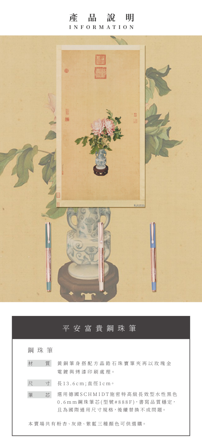 \\故宮經典文物聯名熱銷款// ■商品含平安富貴鋼珠筆1支 ■鋼珠筆芯選用德國施密特黑色水性筆芯,打造流暢的書寫體驗 ■筆芯亦與多款國際規格筆芯通用,便利後續替換 ■附原廠禮盒與品牌提袋,送禮大方
