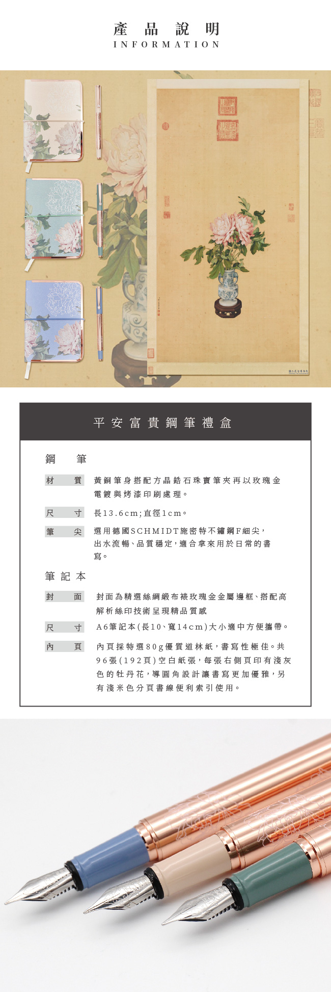 \\故宮經典文物聯名熱銷款// ■商品含平安富貴鋼筆1支、A6筆記本1本、與寓意說明卡1張 ■隨筆附贈吸墨器與黑色卡水各1 ■鋼筆尖選用世界知名、德國品牌施密特鋼筆尖,打造流暢的書寫體驗 ■鋼筆尖尺寸為F細字尖,適合日常書寫 ■筆記本精選絲綢緞布裱玫瑰金金屬邊框 ■附原廠禮盒與品牌提袋,送禮大方