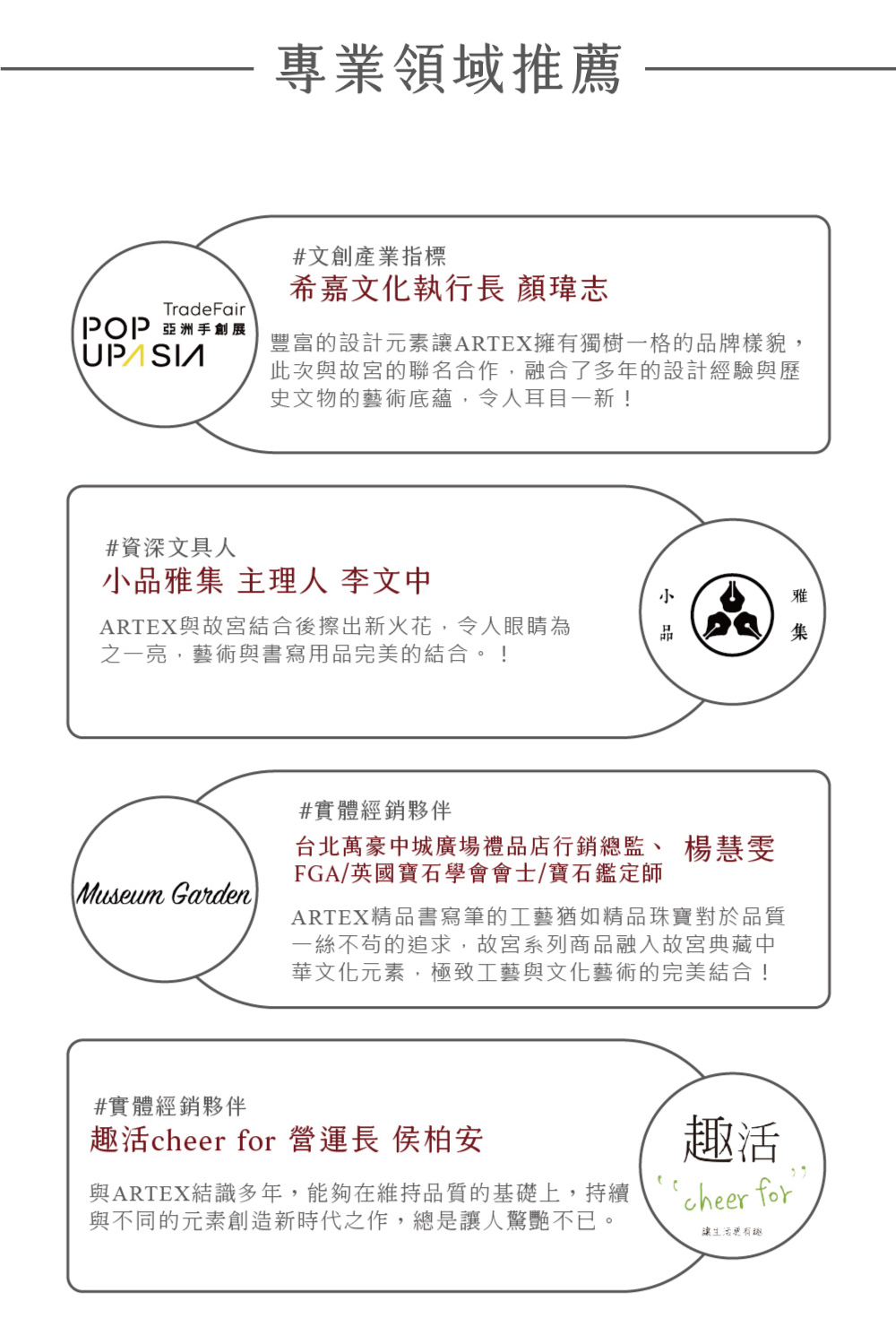 國立故宮博物院 收藏有全世界最多的無價中華藝術寶藏,其收藏品的年代幾乎涵蓋了整個五千年的中國歷史;與法國羅浮宮、英國大英博物館、美國大都會博物館、俄羅斯隱士館並稱為全世界五大博物館。ARTEX的品牌價值在於極多元的風格展現,讓藝術始於生活;故宮的存在,即是將藝術的美好,浸潤你我的生活中。