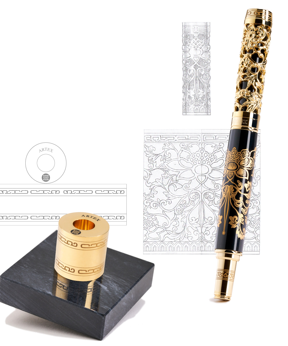 本支筆上半節的立體鏤空筆蓋,即以錫合金金屬為材質,因其較其他金屬柔軟的特性、適合拿來做較繁複的雕刻技藝展現,