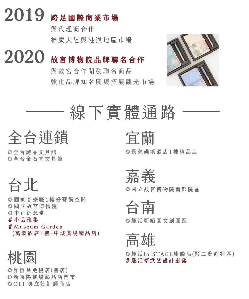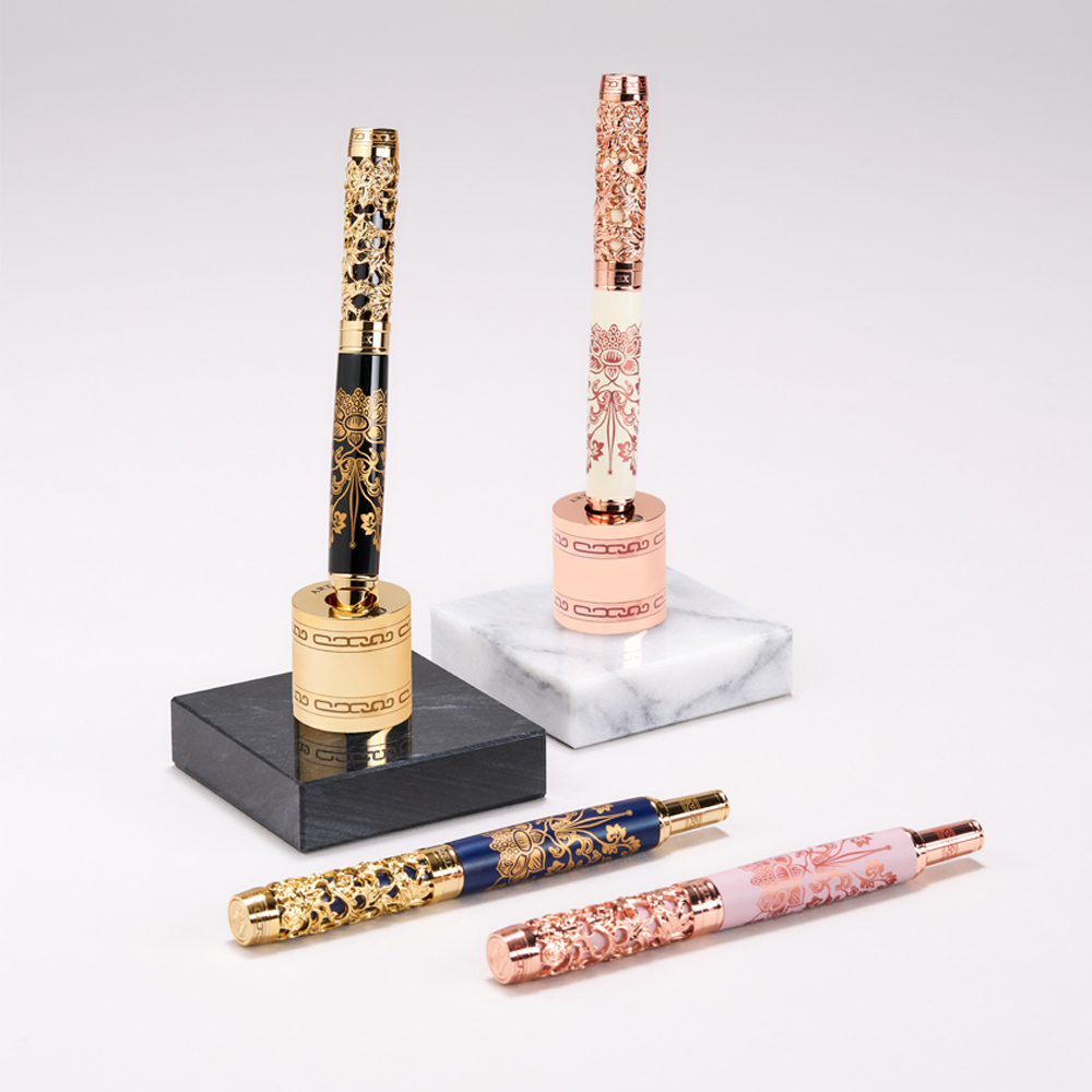 本次與國立故宮博物院聯名,將藏品 「磁胎洋彩金番花青地紙槌瓶」融入產品,以花瓶作為謬思、筆和筆座為載體,創造出乘載著經典的精品文具。將筆幻化成一只優美的古典花瓶,筆座則化成襯托花瓶的托盤,兩件的組合讓筆猶如一件工藝品,不論單獨書寫使用或者放置不用的時候都能用最完美的姿態為生活增添光彩,並在每個細節都加上巧思。