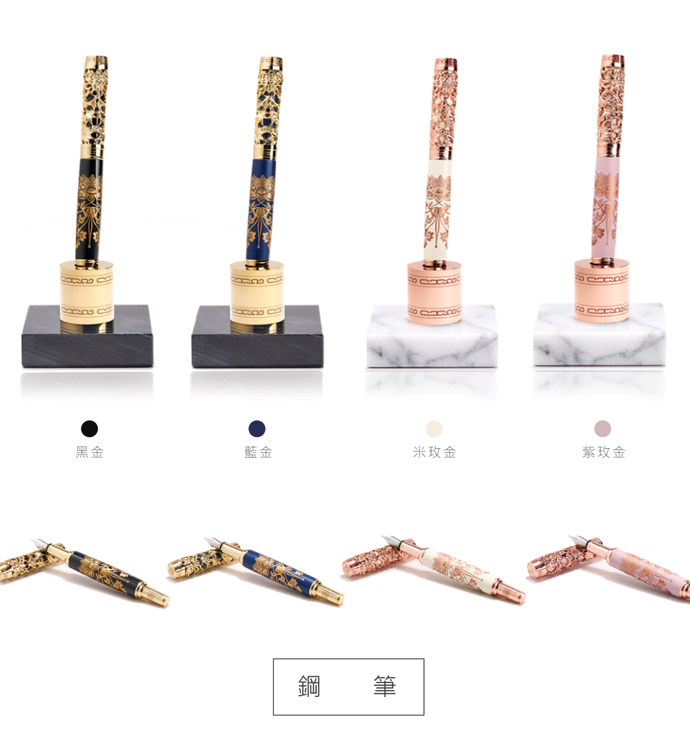 ▇材質-黃銅筆身搭配錫合金鏤空雕刻上蓋,再經過電鍍、烤漆、網版印刷...多重繁複的加工處理而成